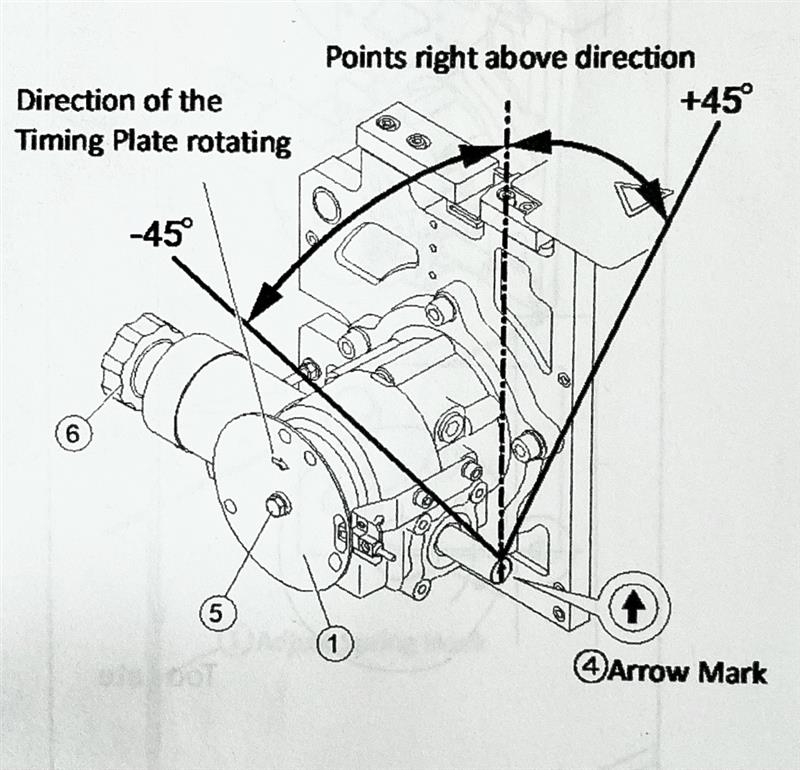 4.The Mark of the Timing Plate moves by above 3. Loosen the fixing bolt 5 and turn the Timing Plate to bring the mark to the position of LS-1. And tighten the fixing bolt 5.